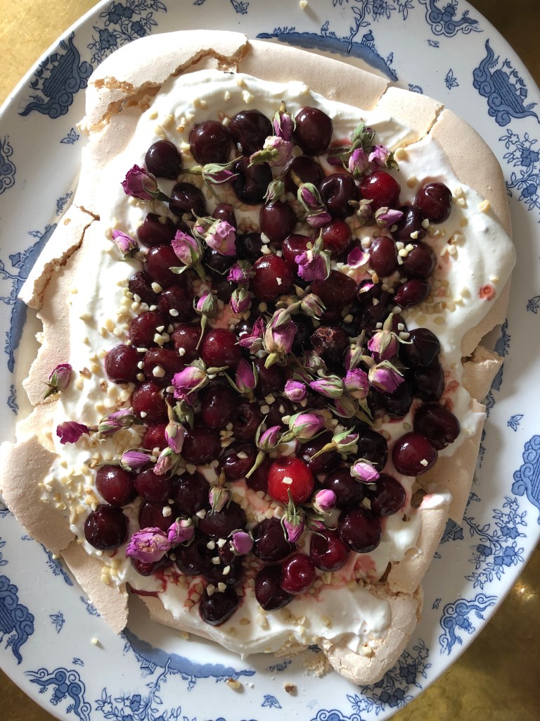 This recipe gives the traditional dessert a flavourful twist. Pavlova is such an easy treat and a fool-proof crowd pleaser but sometimes you just want to mix things up. I love using cherries as they really compliment the flavours of cardamom and rosewater but you can swap them for any other berries if you like. I’ve even used mango and kiwi fruit when I haven’t had any berries at hand. Pavlova is naturally gluten-free, but you can easily make it dairy-free by replacing Greek yoghurt with coconut yoghurt. You can prepare the meringue the night before and just add the filling before serving. I prefer icing sugar over caster sugar as it dissolves quickly and creates gorgeously fluffy merigue.